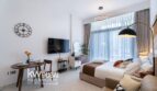 The studio features a smart and functional layout with a bright living space complemented by large windows that allow natural light to fill the apartment. The unit is thoughtfully designed to maximize space while maintaining a stylish and comfortable living environment.